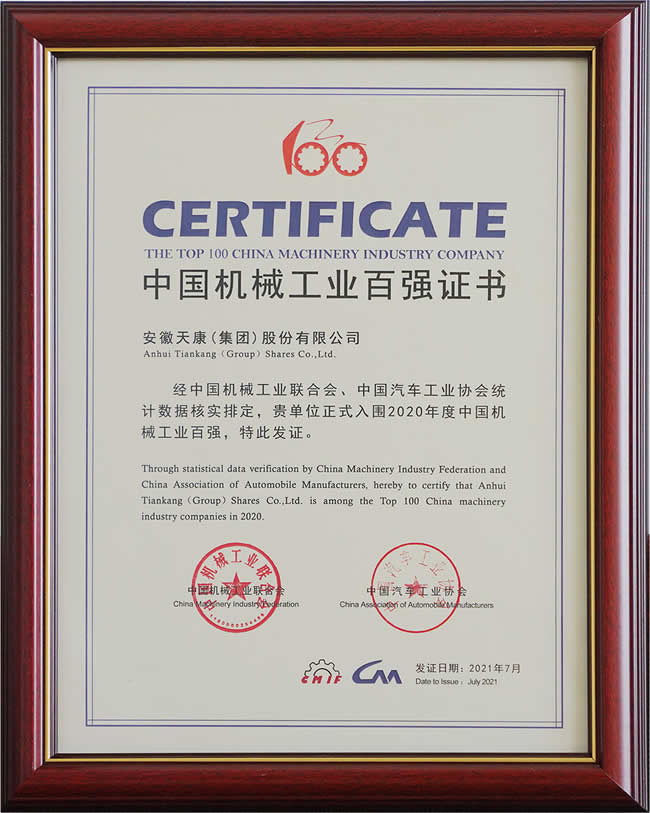 7月28日,由中國機械工業(yè)聯(lián)合會、中國汽車工業(yè)協(xié)會共同主辦的第十七屆“中國機械工業(yè)百強、汽車工業(yè)整車二十強、零部件三十強企業(yè)信息發(fā)布會”在四川省德陽市隆重召開。會上公布了2020年度中國機械工業(yè)百強企業(yè)名單,安徽天康集團再度榮獲百強企業(yè)稱號,名列第37位。